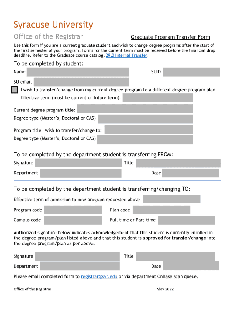 Syracuse University Office of the RegistrarGraduate Program Transfer Forms this form if you are a current graduate student and wish to change degree programs after the start of the first semester