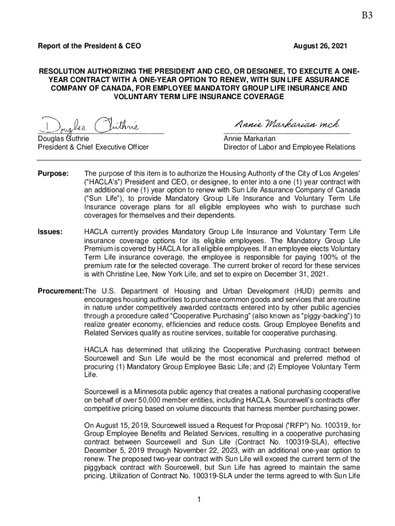 B3 Report of the President & CEO August 26, 2021RESOLUTION AUTHORIZING THE PRESIDENT AND CEO, OR DESIGNEE, TO EXECUTE A NEYMAR CONTRACT WITH A NEYMAR OPTION TO RENEW, WITH SUN LIFE ASSURANCE COMPANY