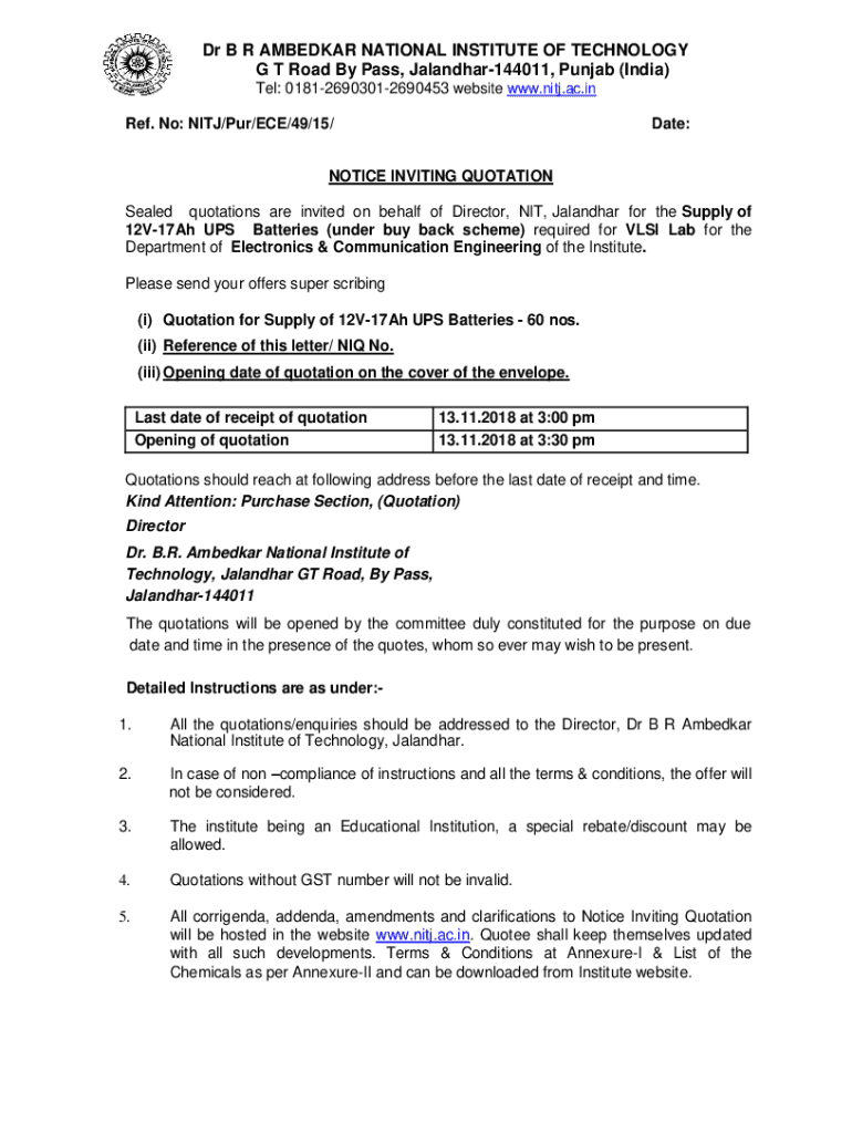 Dr B R AMBER NATIONAL INSTITUTE OF TECHNOLOGY G T Road By Pass, Jalandhar144011, Punjab (India) Tel: 018126903012690453 website www.nitj.ac.in Ref. No: NITA/PUR/ECE/49/15/Date:NOTICE INVITING QUOTATION