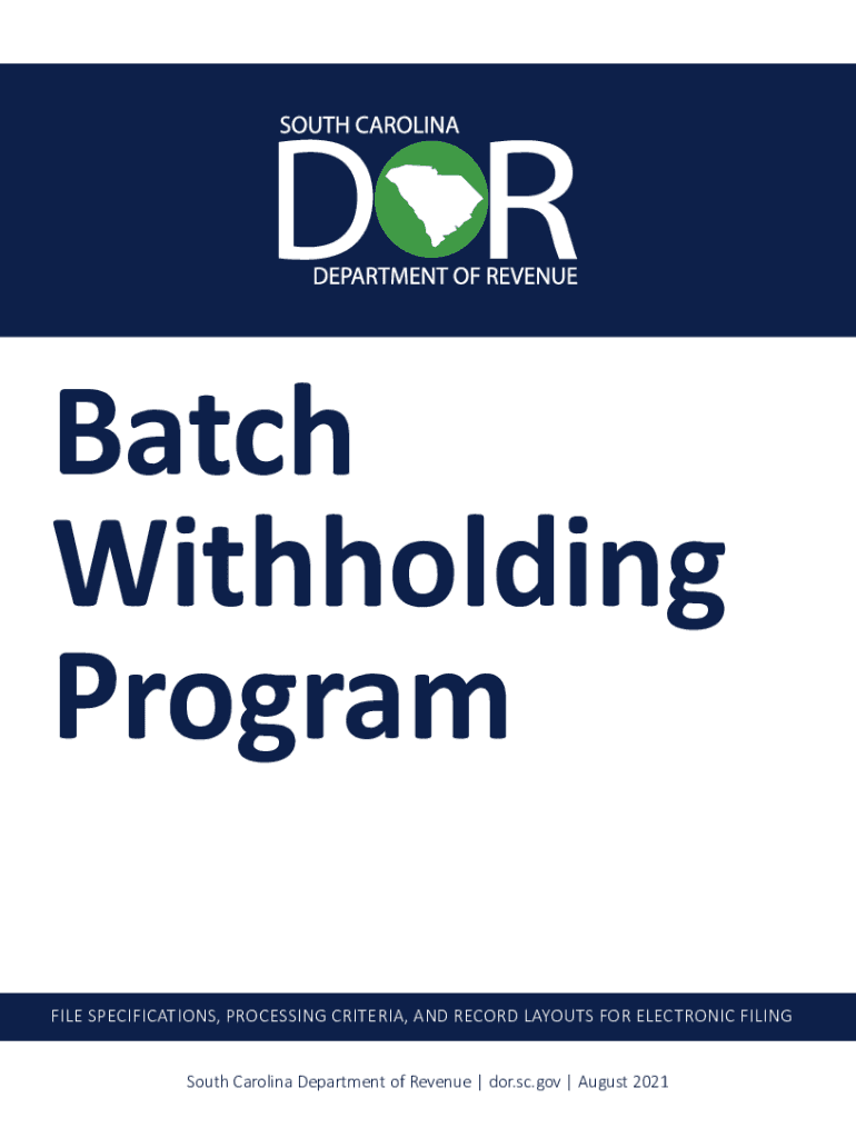 Batch Withholding Program FILE SPECIFICATIONS, PROCESSING CRITERIA, AND RECORD LAYOUTS FOR ELECTRONIC FILING South Carolina Department of Revenue | for.SC.gov | August 2021Contents Introduction. .