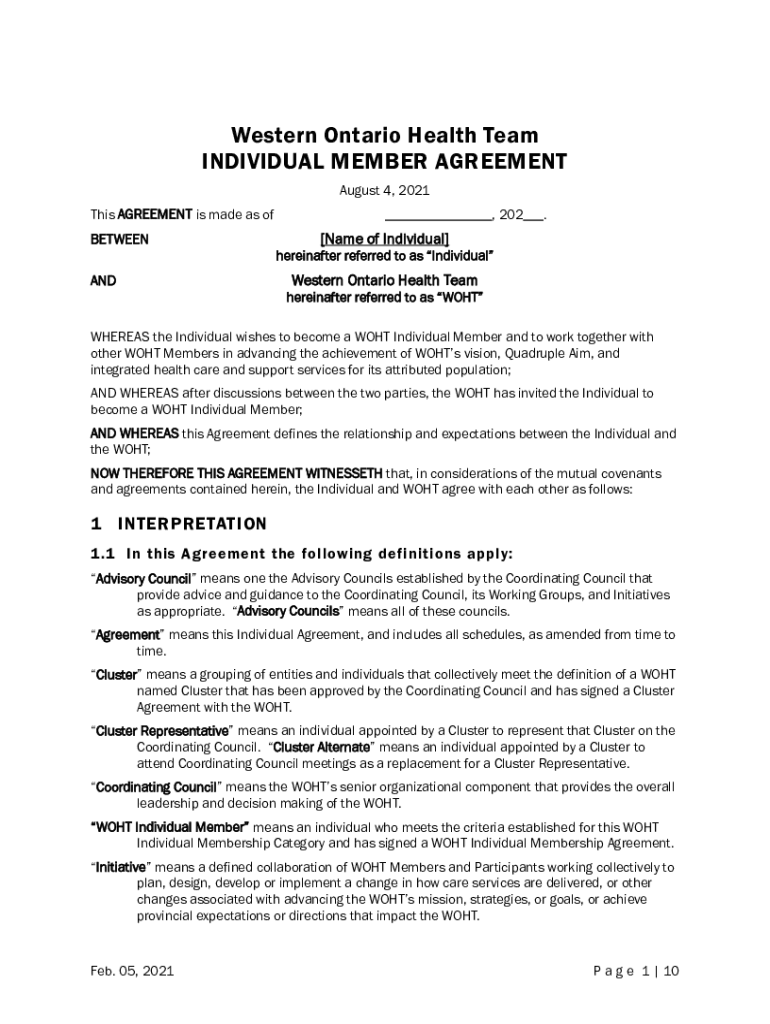 Western Ontario Health Team INDIVIDUAL MEMBER AGREEMENT August 4, 2021, This AGREEMENT is made as of BETWEEN AND, 202.[Name of Individual]hereinafter referred to as Individual Western Ontario Health