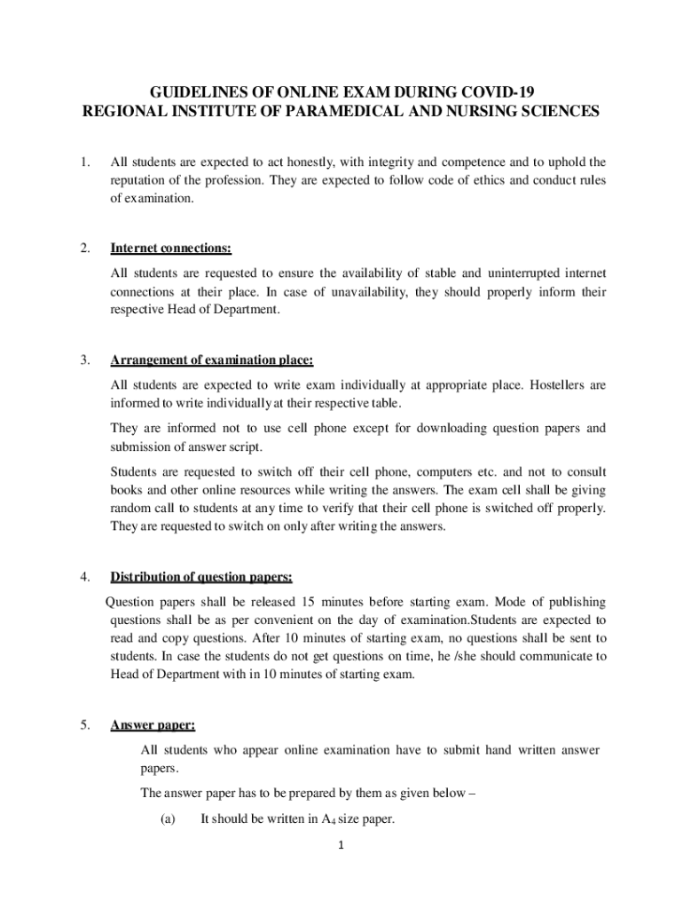 GUIDELINES OF ONLINE EXAM DURING COVID-19 REGIONAL INSTITUTE OF PARAMEDICAL AND NURSING SCIENCES 1. All students are expected to act honestly, with integrity and competence and to uphold the reputation