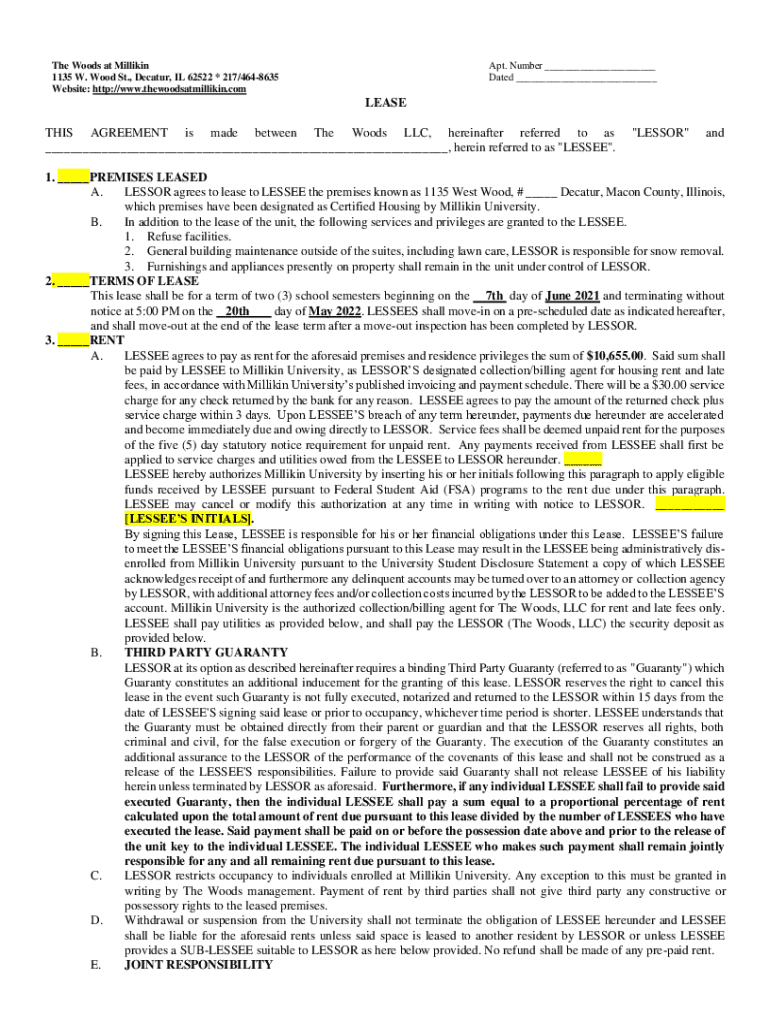 The Woods at Millikan 1135 W. Wood St., Decatur, IL 62522 × 217/4648635 Website: http://www.thewoodsatmillikin.comApt. Number ___ Dated ___LEASE THIS AGREEMENT is made between The Woods LLC, hereinafter