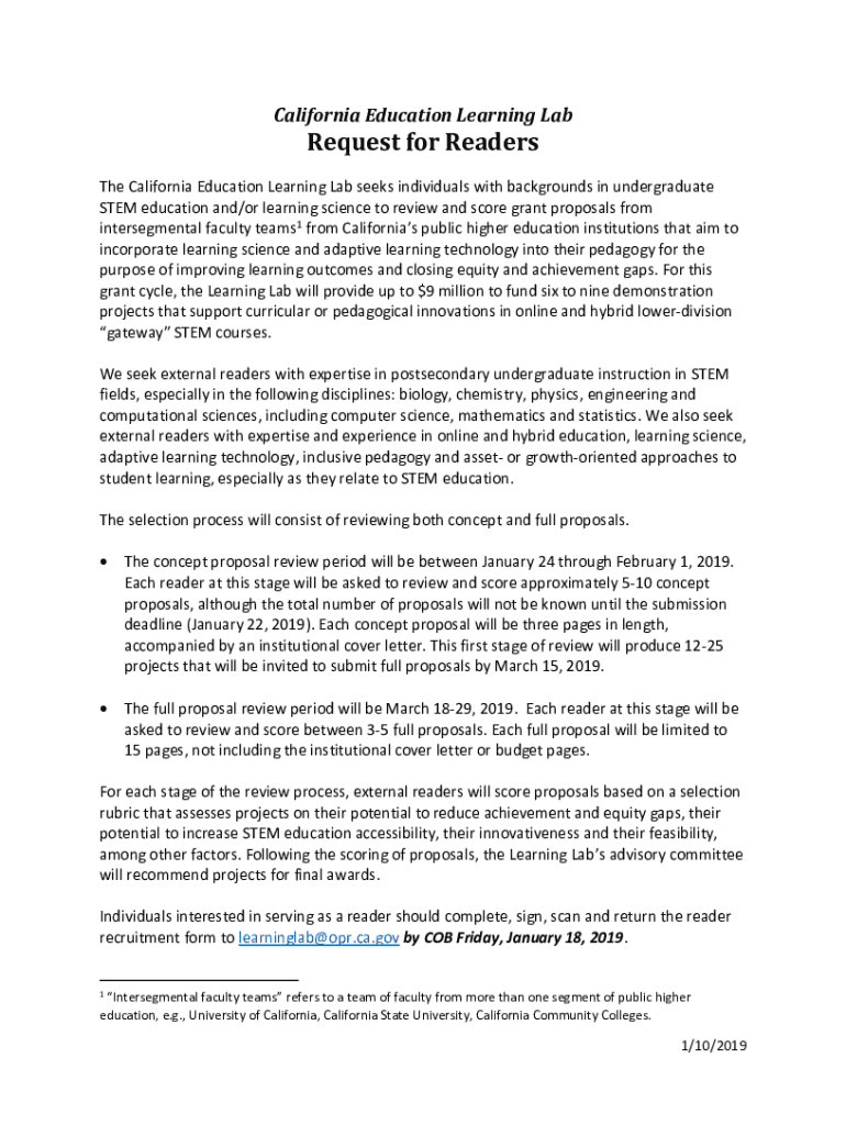 California Education Learning Request for Readers The California Education Learning Lab seeks individuals with backgrounds in undergraduate STEM education and/or learning science to review and score