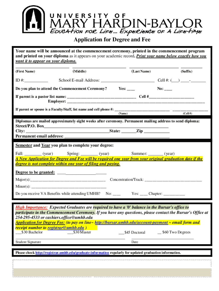 Application for Degree and Fee Your name will be announced at the commencement ceremony, printed in the commencement program and printed on your diploma as it appears on your academic record. Print