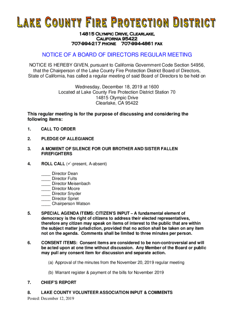 NOTICE OF A BOARD OF DIRECTORS REGULAR MEETING NOTICE IS HEREBY GIVEN, pursuant to California Government Code Section 54956, that the Chairperson of the Lake County Fire Protection District Board