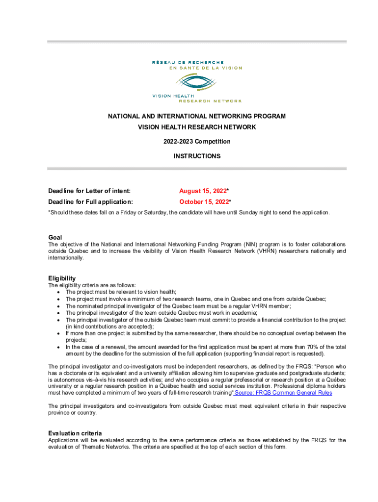 NATIONAL AND INTERNATIONAL NETWORKING PROGRAM VISION HEALTH RESEARCH NETWORK 20222023 Competition INSTRUCTIONSDeadline for Letter of intent:August 15, 2022×Deadline for Full application:October 15,