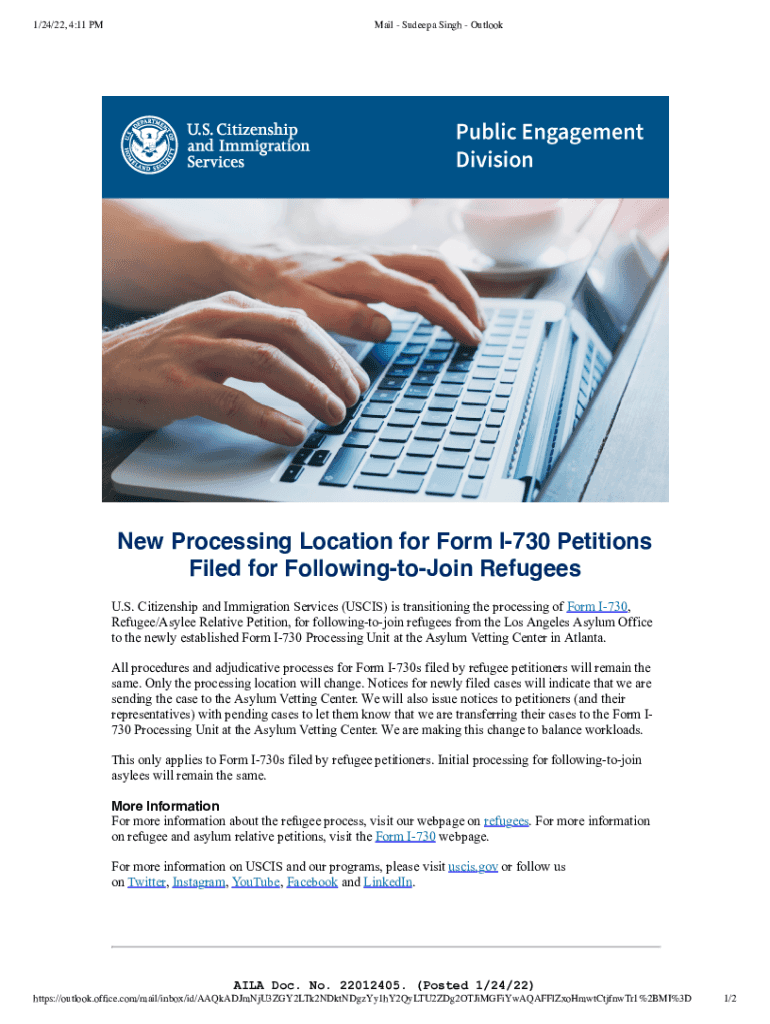 1/24/22, 4:11 Email Sundeep Singh Outlook Processing Location for Form I730 Petitions