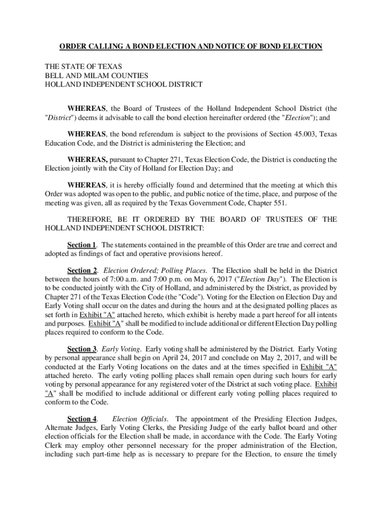 ORDER CALLING A BOND ELECTION AND NOTICE OF BOND ELECTION THE STATE OF TEXAS BELL AND MILAN COUNTIES HOLLAND INDEPENDENT SCHOOL DISTRICT WHEREAS, the Board of Trustees of the Holland Independent School