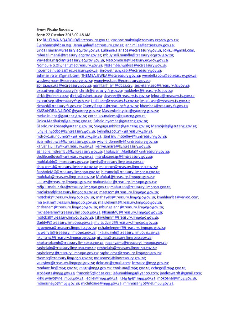 From: Elsa be Moscow Sent: 22 October 2018 09:48 AM To: BULELWA.NQADOLO@ectreasury.gov.za; cyclone.makola@treasury.ecprov.gov.za; E.grahams@dbsa.org; Jama.qaba@ectreasury.gov.za; ann.miles@ectreasury.gov.za;