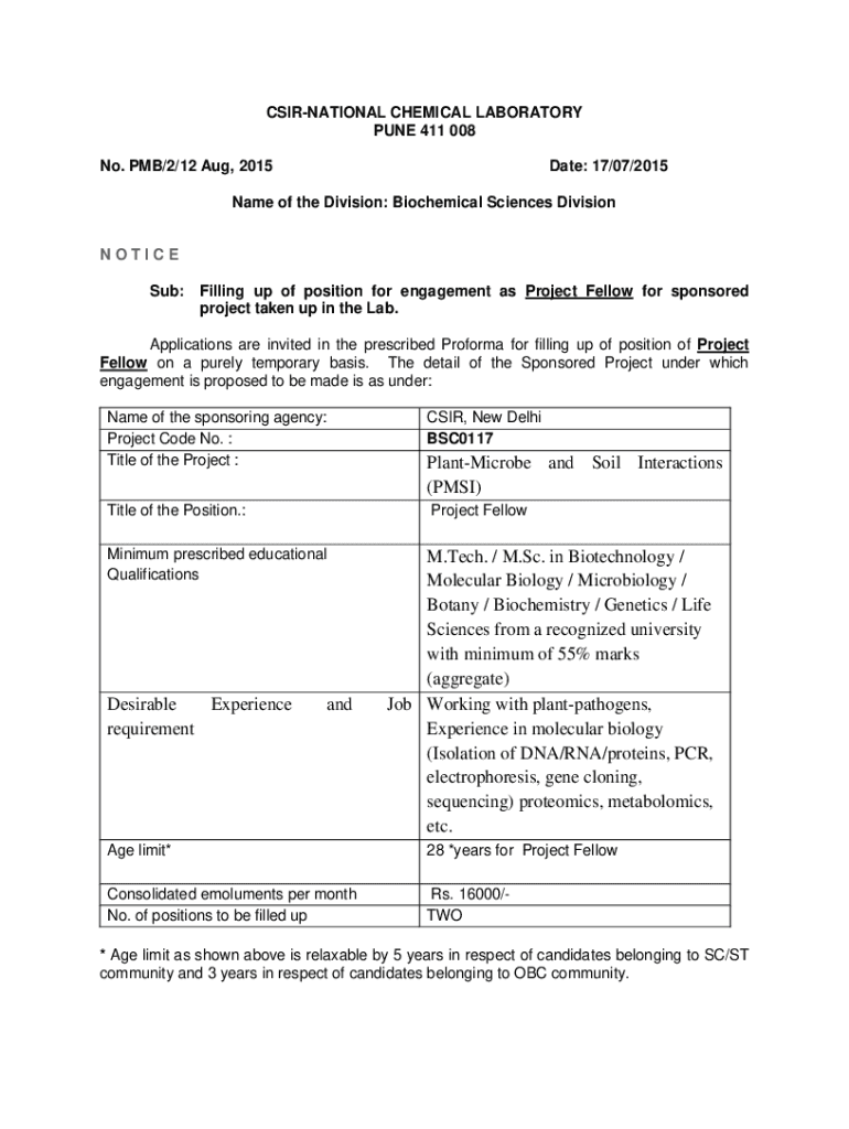 No. PMB/2/12 Aug, 2015Date: 17/07/2015Name of the Division: Biochemical Sciences Division