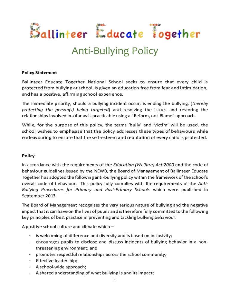 AntiBullying Policy Statement Balladeer Educate Together National School seeks to ensure that every child is protected from bullying at school, is given an education free from fear and intimidation,