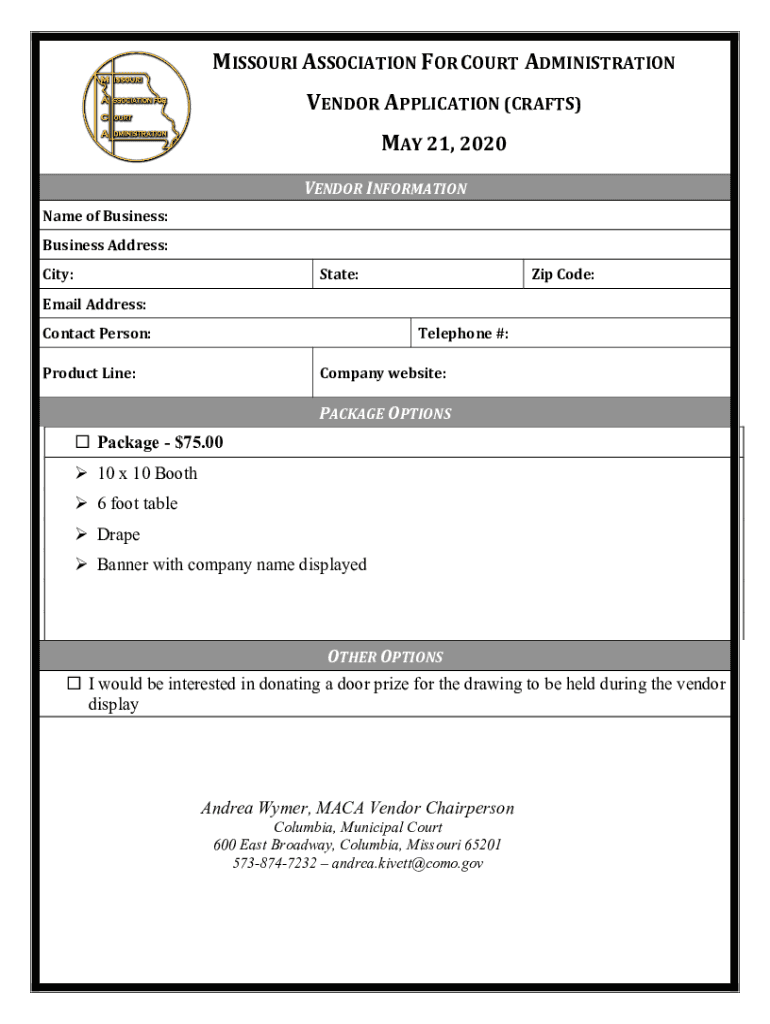 MISSOURI ASSOCIATION FOR COURT ADMINISTRATION VENDOR APPLICATION (CRAFTS) MAY 21, 2020, VENDOR INFORMATION Name of Business: Business Address: City:State:Zip Code:Email Address: Contact Person:Telephone