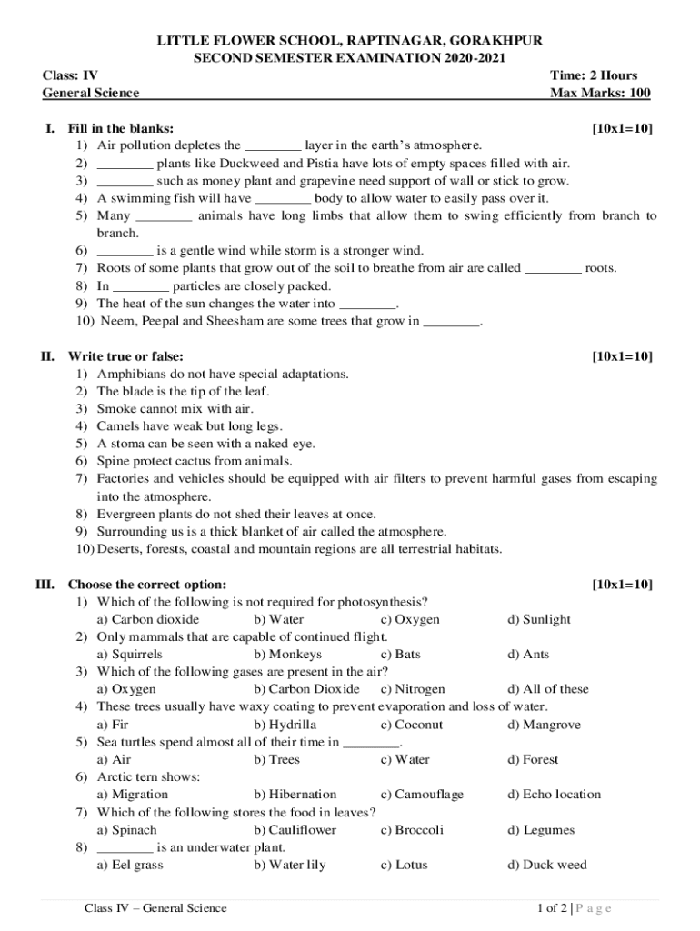 LITTLE FLOWER SCHOOL, RAPTINAGAR, GORAKHPUR SECOND SEMESTER EXAMINATION 20202021 Class: IV General Scientize: 2 Hours Max Marks: 100I. Fill in the blanks: [10×110] 1) Air pollution depletes the ___