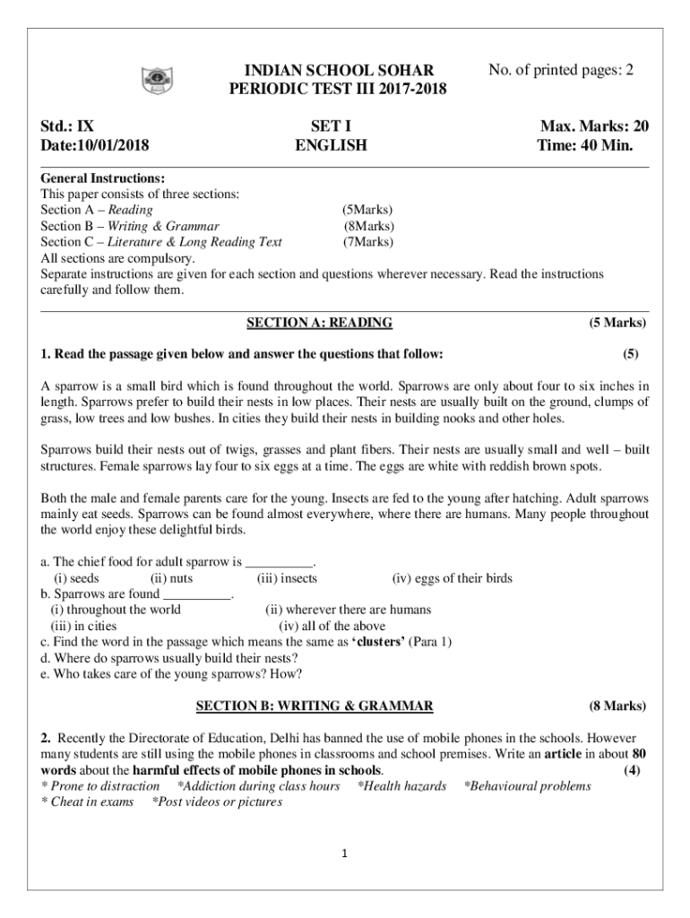 INDIAN SCHOOL SOLAR PERIODIC TEST III 20172018 Std.: IX Date:10/01/2018No. Of printed pages: 2SET I Englishman. Marks: 20 Time: 40 Min.___ General Instructions: This paper consists of three sections: