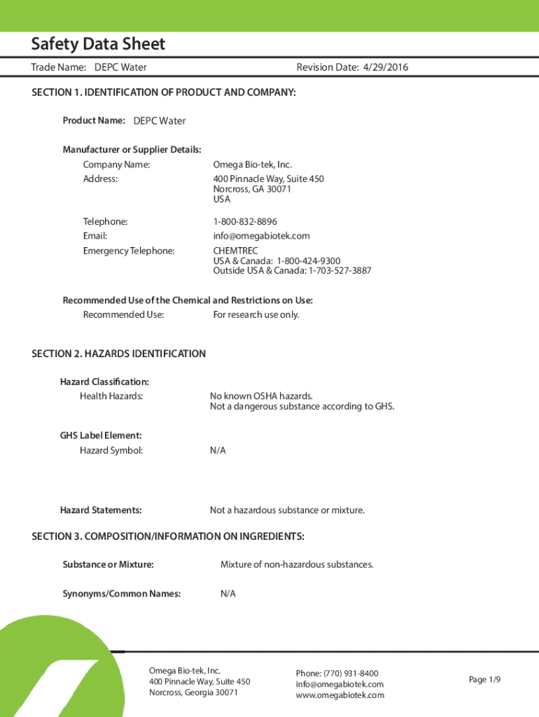 Safety Data Sheet Trade Name: DEC WaterRevision Date: 4/29/2016SECTION 1. IDENTIFICATION OF PRODUCT AND COMPANY: Product Name: DEC Water Manufacturer or Supplier Details: Company Name: Address:Telephone: