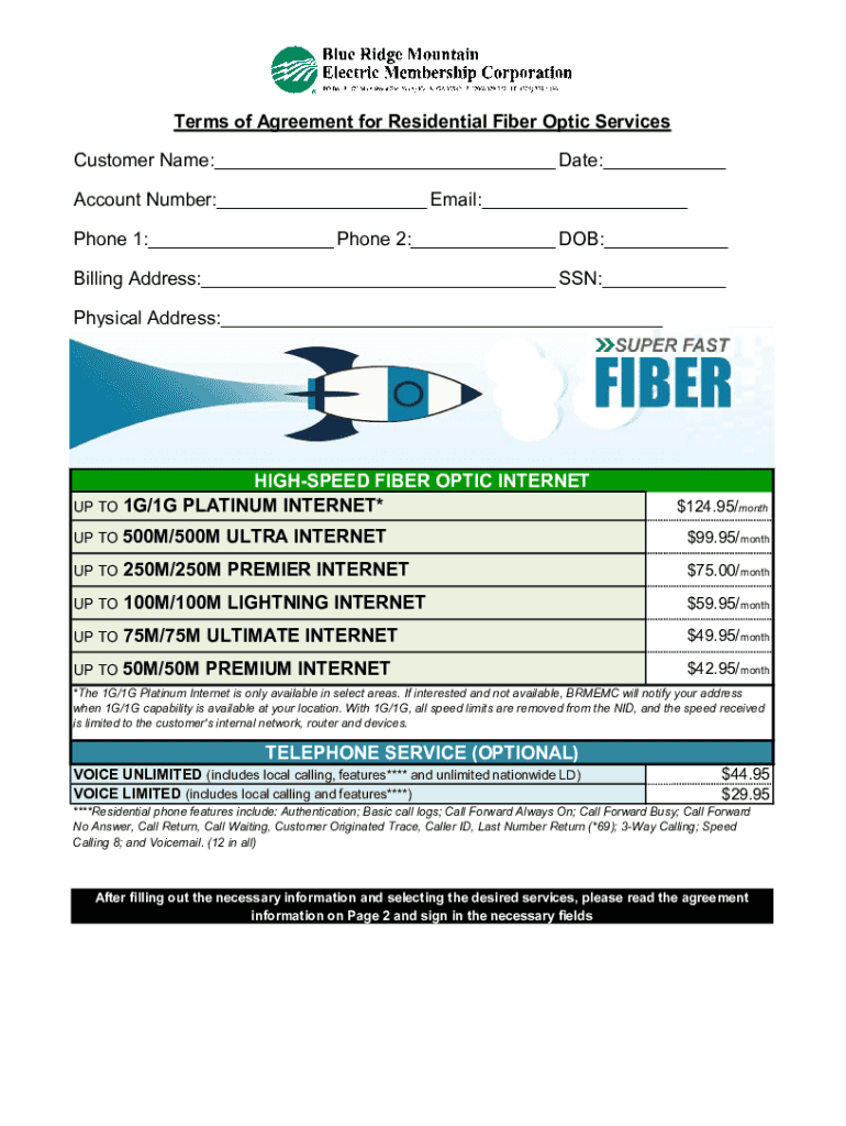 Terms of Agreement for Residential Fiber Optic ServicesDate:___ Customer Name:___ Email:___ Account Number:___ DOB:___ Phone 1:___ Phone 2:___ SSN:___ Billing Address:___ Physical Address:___AIRSPEED