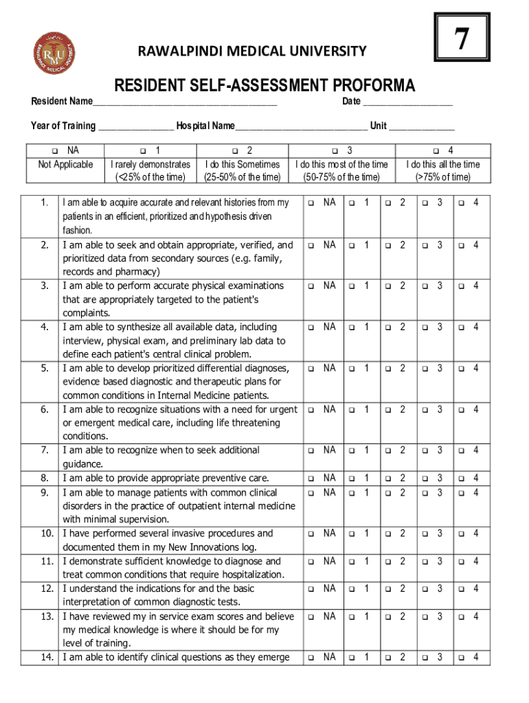 7RAWALPINDI MEDICAL UNIVERSITYRESIDENT REASSESSMENT PROFORMA Resident Name___Date ___Year of Training ___ Hospital Name___ Unit ___ NA Not Applicable 1 I rarely demonstrate (25% of the time) 2 I do