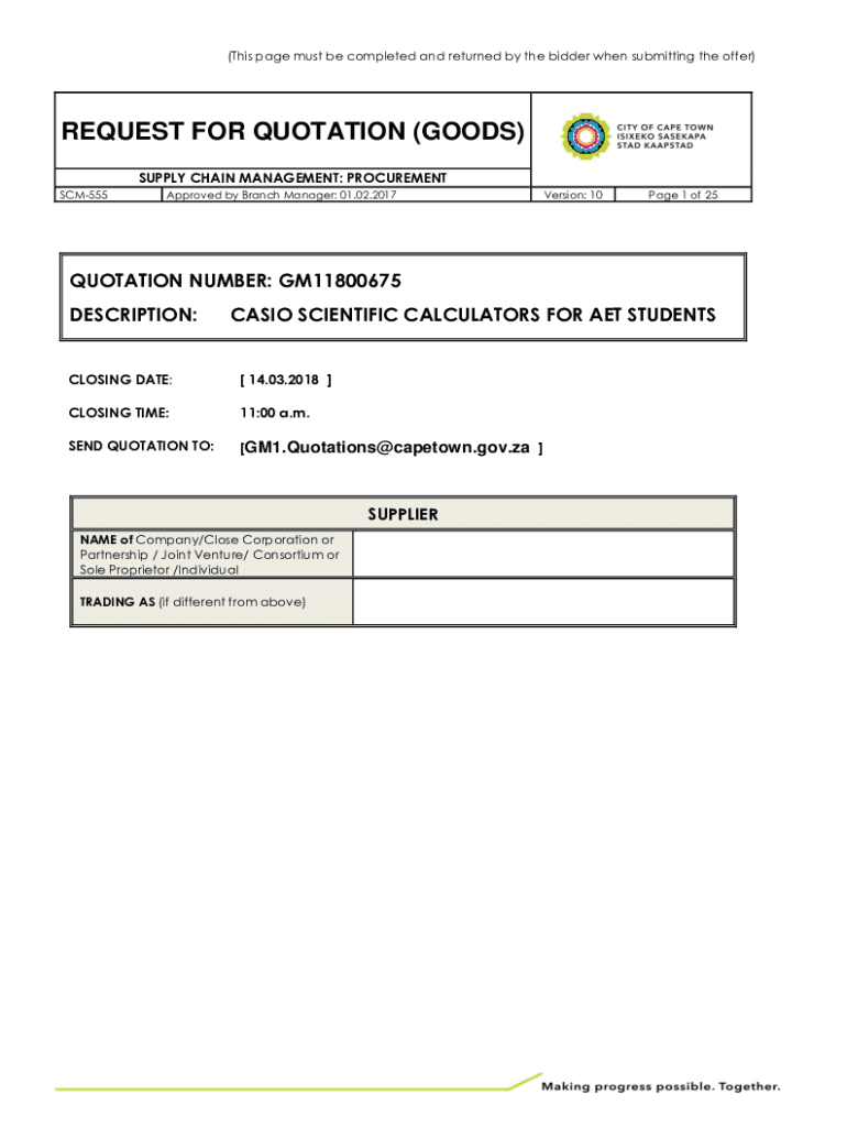 (This page must be completed and returned by the bidder when submitting the offer)REQUEST FOR QUOTATION (GOODS) SUPPLY CHAIN MANAGEMENT: PROCUREMENT SCM555Approved by Branch Manager: 01.02.2017Version: