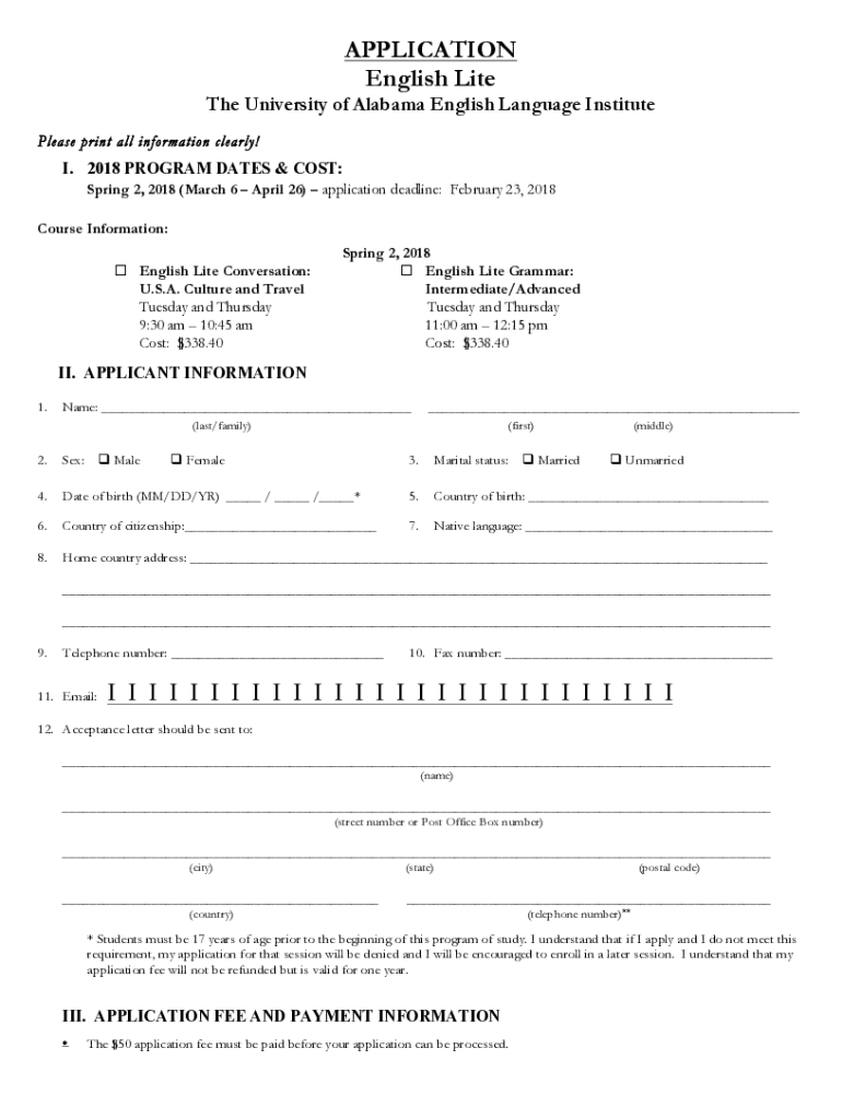 APPLICATION English Lite The University of Alabama English Language Institute Please print all information clearly! I. 2018 PROGRAM DATES & COST: Spring 2, 2018 (March 6 April 26) application deadline:
