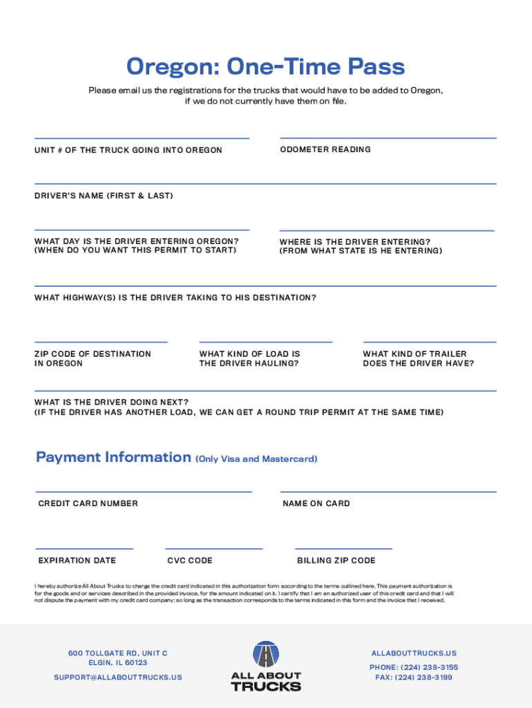 Oregon: Onetime Pass Please email us the registrations for the trucks that would have to be added to Oregon, if we do not currently have them on file. U NIT # OF T H E TRUCK GO I N G I N TO OR EGO