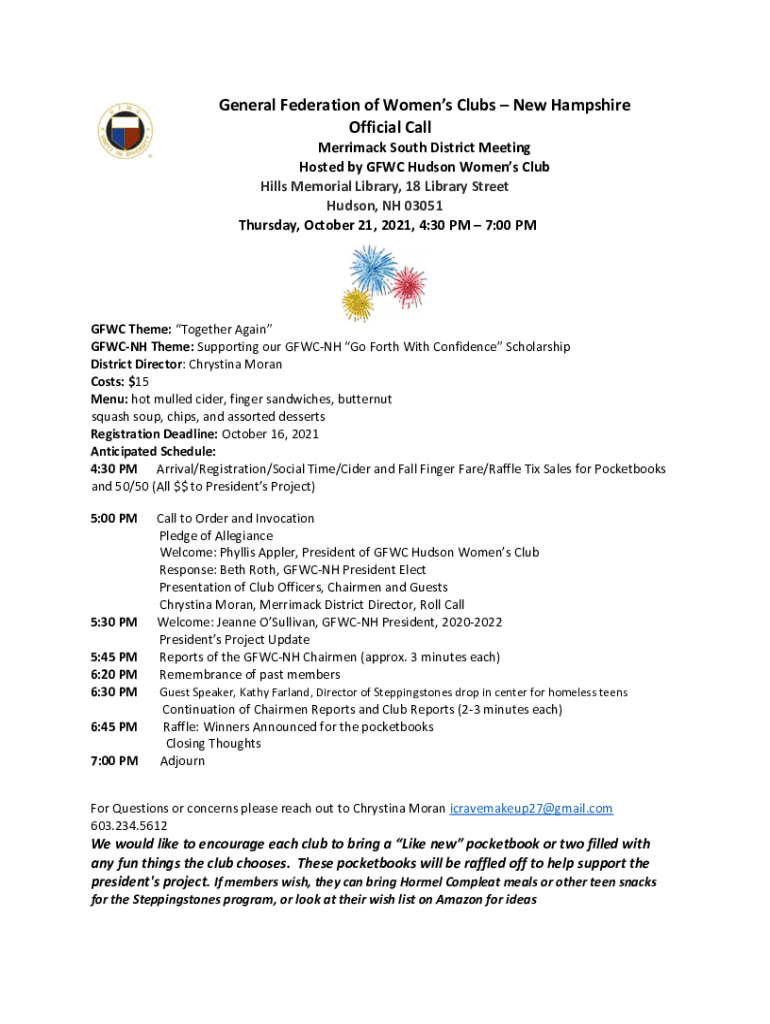 General Federation of Women's Clubs New Hampshire Official Call Merrimack South District Meeting Hosted by GFWC Hudson Women's Club Hills Memorial Library, 18 Library Street Hudson, NH 03051 Thursday,