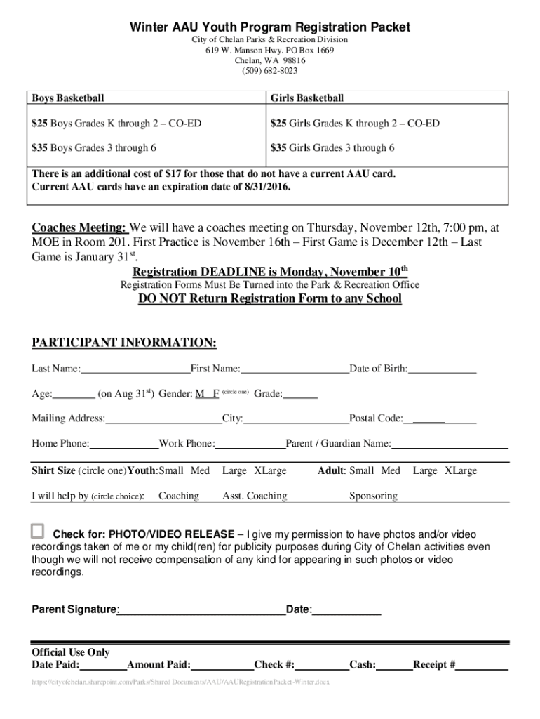 Get the free Winter AAU Youth Program Registration Packet ... - City of Chelan