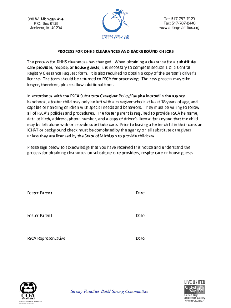 Tel: 5177877920 Fax: 5177872440 www.strongfamilies.org330 W. Michigan Ave. P.O. Box 6128 Jackson, MI 49204PROCESS FOR HHS CLEARANCES AND BACKGROUND CHECKS The process for HHS clearances has changed.