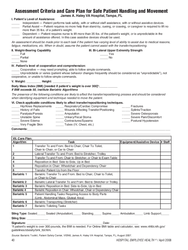 Assessment Criteria and Care Plan for Safe Patient Handling and Movement James A. Haley VA Hospital, Tampa, FL I. Patients Level of Assistance: ___ Independent Patient performs task safely, with or