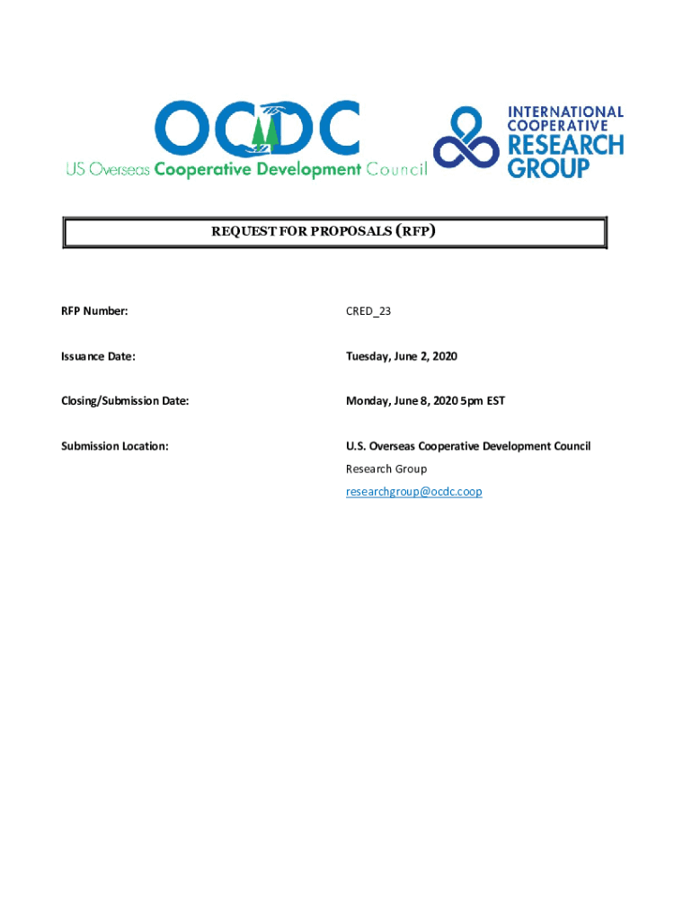 REQUEST FOR PROPOSALS (RFP)RFP Number:CRED_23Issuance Date:Tuesday, June 2, 2020Closing/Submission Date:Monday, June 8, 2020 5pm Submission Location:U.S. Overseas Cooperative Development Council Research