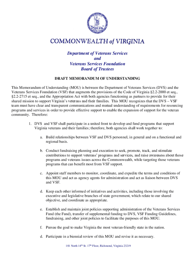 Department of Veterans Services and Veterans Services Foundation Board of Trustees DRAFT MEMORANDUM OF UNDERSTANDING This Memorandum of Understanding (YOU) is between the Department of Veterans Services