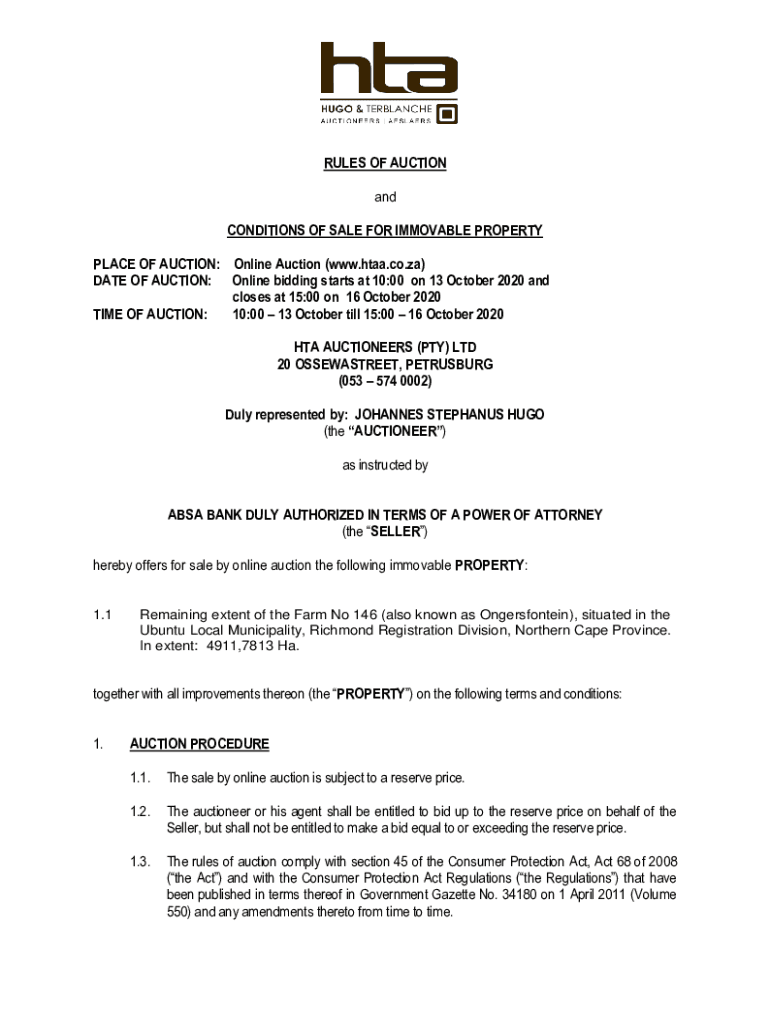 RULES OF AUCTION and CONDITIONS OF SALE FOR IMMOVABLE PROPERTY PLACE OF AUCTION: Online Auction (www.htaa.co.za) DATE OF AUCTION: Online bidding starts at 10:00 on 13 October 2020 and closes at 15:00