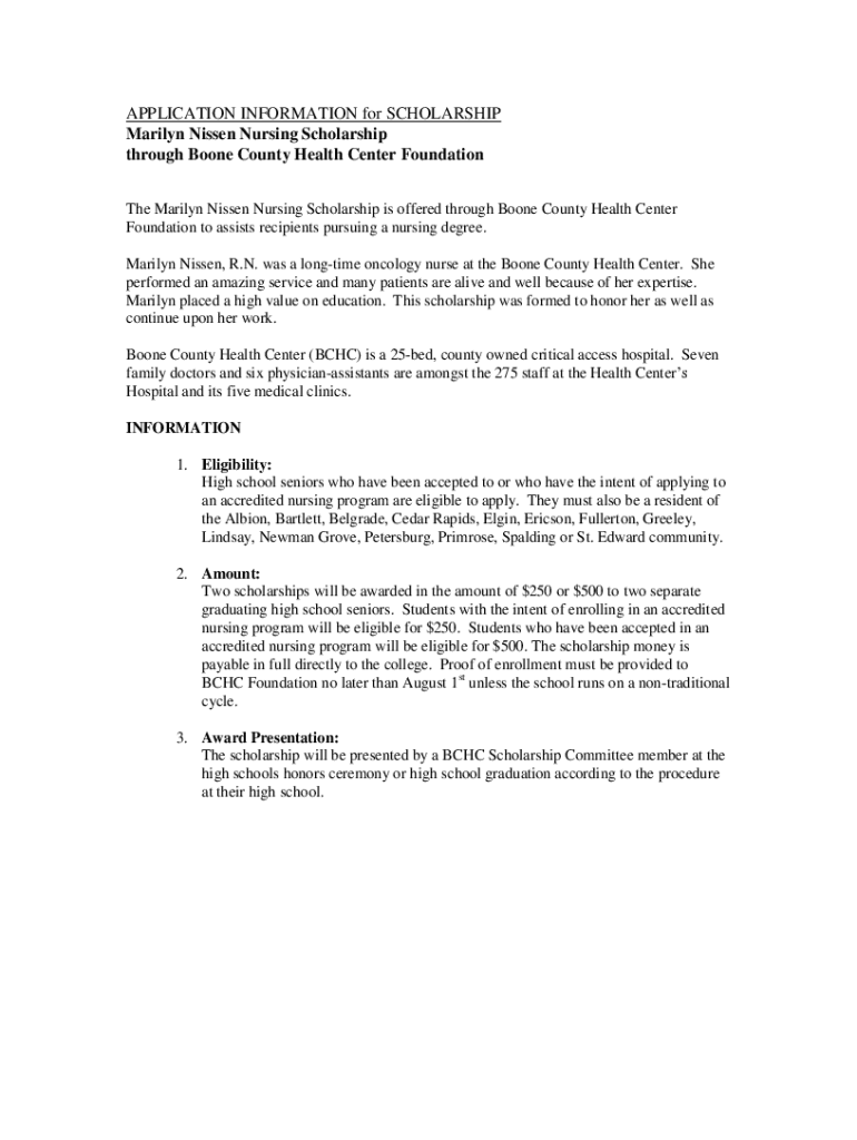 APPLICATION INFORMATION for SCHOLARSHIP Marilyn Nissan Nursing Scholarship through Boone County Health Center Foundation The Marilyn Nissan Nursing Scholarship is offered through Boone County Health