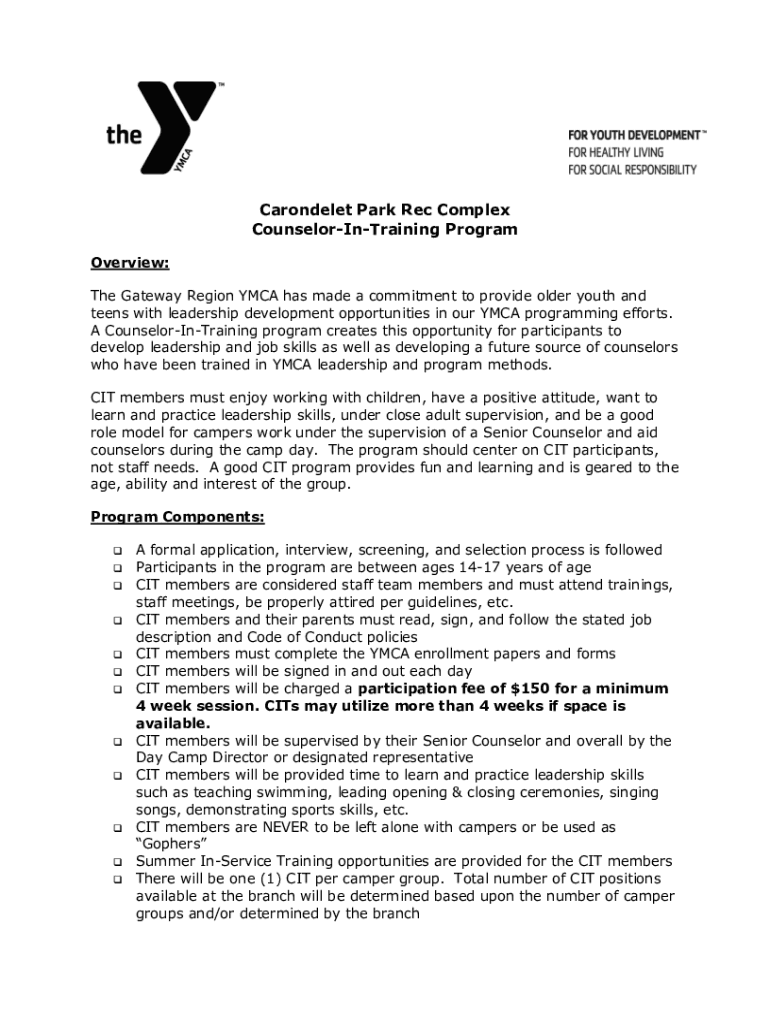 Carbondale Park Rec Complex CounselorInTraining Program Overview: The Gateway Region YMCA has made a commitment to provide older youth and teens with leadership development opportunities in our YMCA