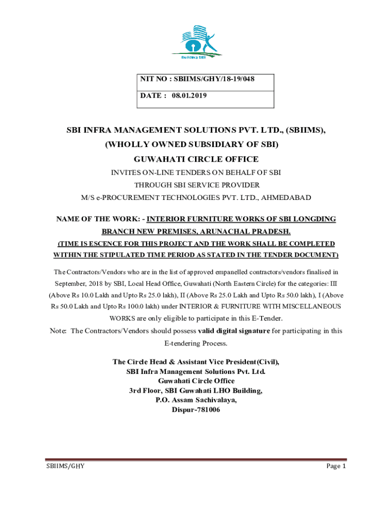 NIT NO : SBI IMS/WHY/1819/048 DATE : 08.01.2019SBI INFRA MANAGEMENT SOLUTIONS PVT. LTD., (SBI IMS), (WHOLLY OWNED SUBSIDIARY OF SBI)GUWAHATI CIRCLE OFFICE INVITES ONLINE TENDERS ON BEHALF OF SBI THROUGH