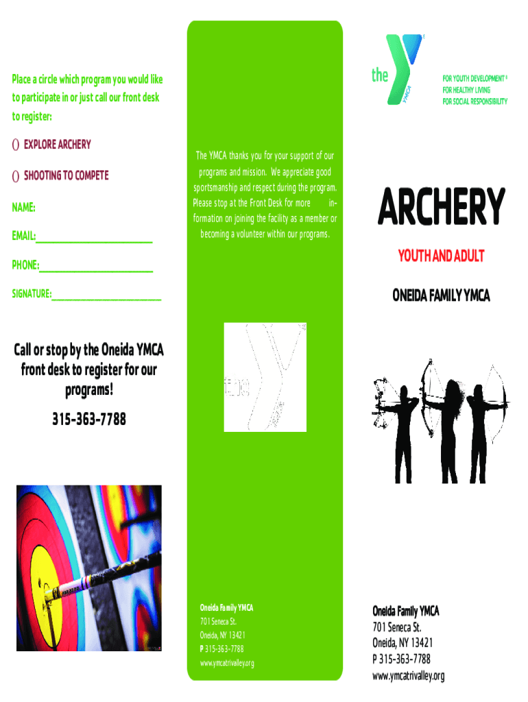 REGISTRATION: Place a circle which program you would like to participate in or just call our front desk to register:EXPLORE ARCHERYSHOOTING TO COMPETENCE: EMAIL:___The YMCA thanks you for your support