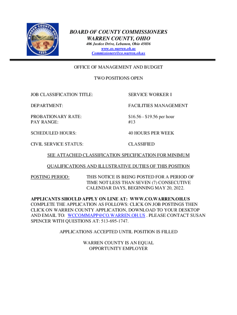 BOARD OF COUNTY COMMISSIONERS WARREN COUNTY, OHIO 406 Justice Drive, Lebanon, Ohio 45036 www.co.warren.oh.us Commissioners@co.warren.oh.usOFFICE OF MANAGEMENT AND BUDGET TWO POSITIONS OpenGov CLASSIFICATION