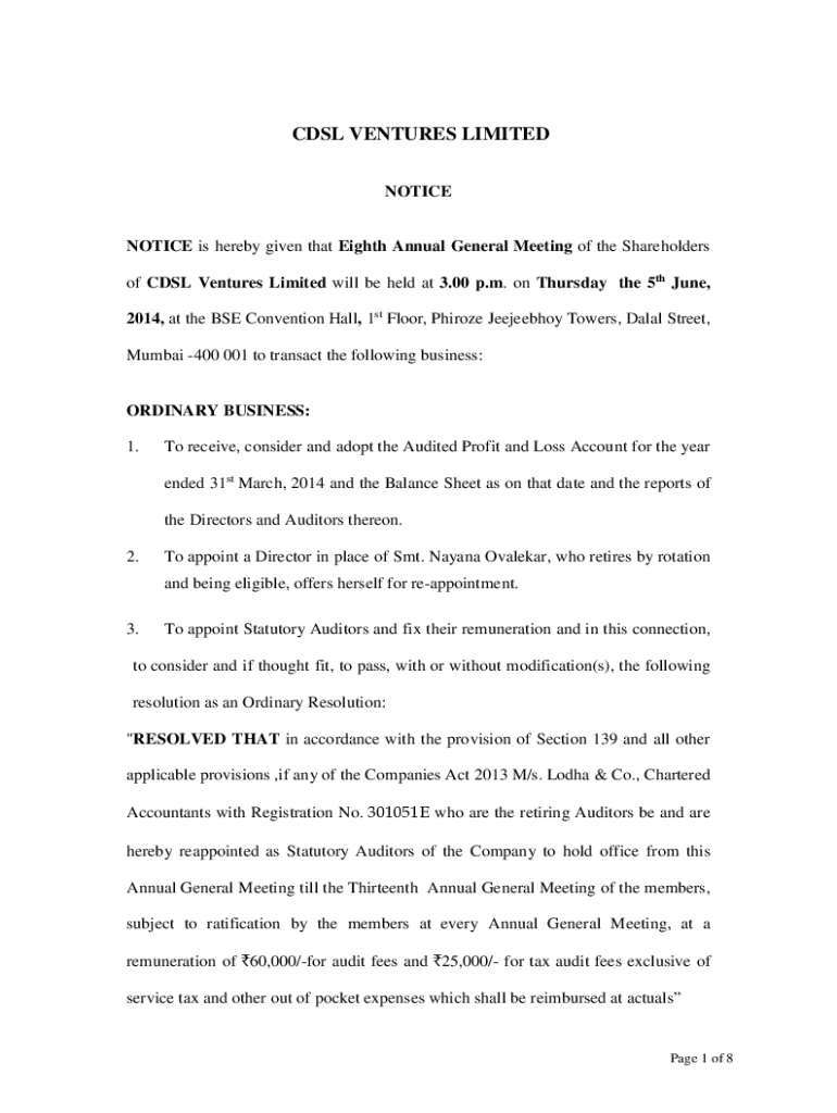 Get the free Notice of 8th AGM.pdf - CDSL Ventures Limited