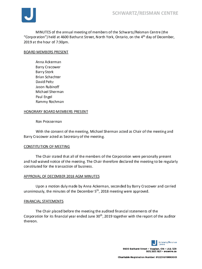 SCHWARTZ/HEISMAN CENTREMINUTES of the annual meeting of members of the Schwartz/Tasman Center (the Corporation) held at 4600 Bathurst Street, North York, Ontario, on the 4th day of December 2019 at