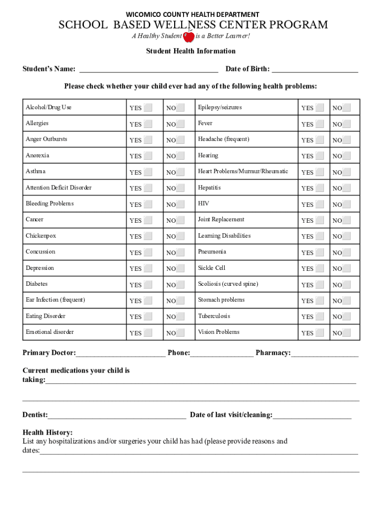 COMIC COUNTY HEALTH DEPARTMENTSCHOOL BASED WELLNESS CENTER PROGRAM A Healthy student a Better Learner! Student Health Information Students Name: ___Date of Birth: ___Please check whether your child