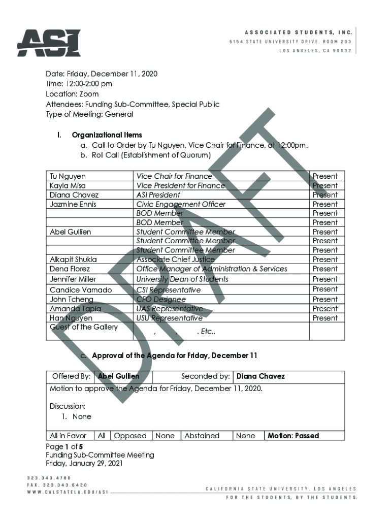 Date: Friday, December 11, 2020, Time: 12:002:00 pm Location: Zoom Attendees: Funding Subcommittee, Special Public Type of Meeting: General I. Organizational Items a. Call to Order by Tu Nguyen, Vice