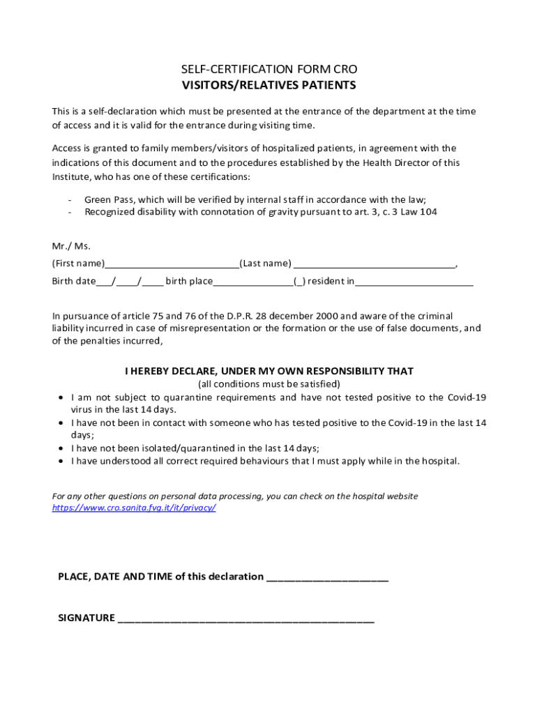 RECERTIFICATION FORM CRO VISITORS/RELATIVES PATIENTS This is a self declaration which must be presented at the entrance of the department at the time of access, and it is valid for the entrance during