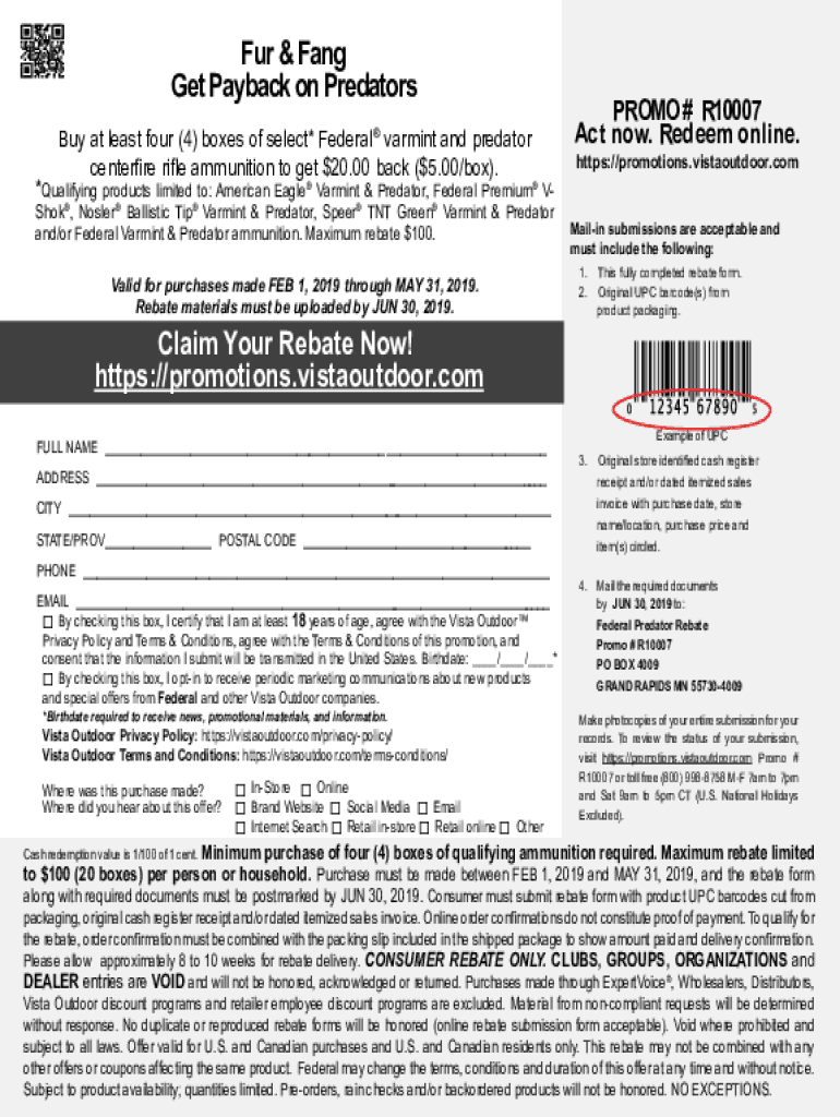 Fur & Fang Get Payback on Predators Buy at least four (4) boxes of select* Federal varmint and predator center fire rifle ammunition to get $20.00 back ($5.00/box).×Qualifying products limited to: