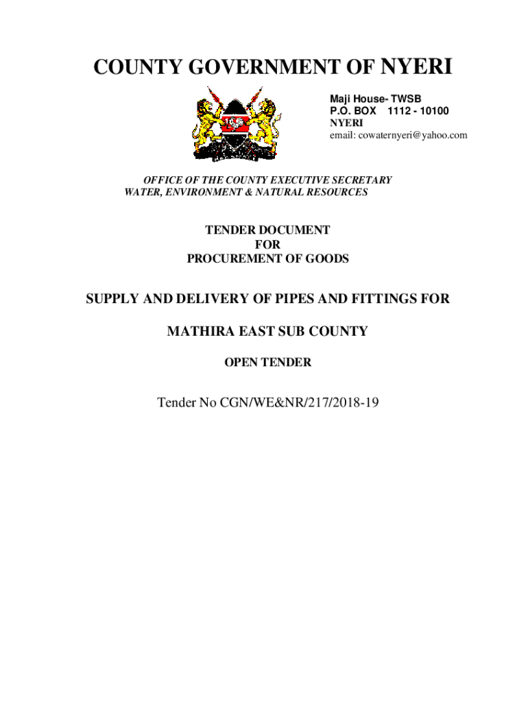 COUNTY GOVERNMENT OF MYERS Meiji House TSB P.O. BOX 1112 10100 MYERS email: cowaternyeri@yahoo.comOFFICE OF THE COUNTY EXECUTIVE SECRETARY WATER, ENVIRONMENT & NATURAL RESOURCESTENDER DOCUMENT FOR