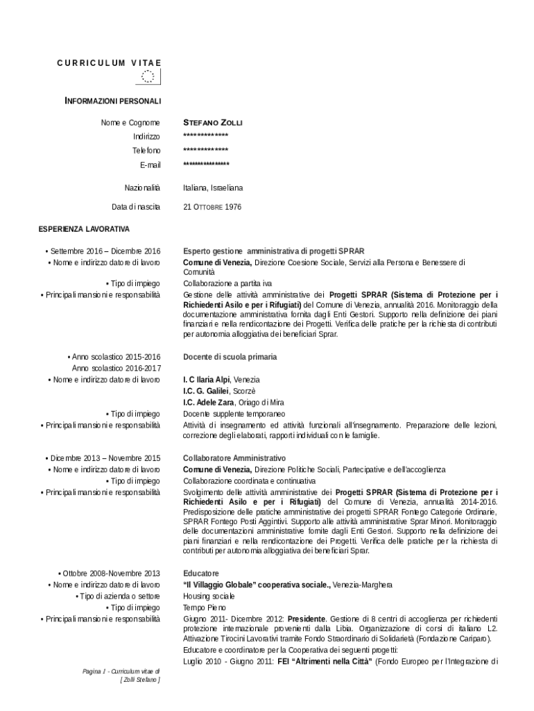 C U R R I C U L U M V I TA EINFORMAZIONI PERSONALI Nome e CognomeSTEFANO ZOLLIIndirizzo*************Telefono*************Email****************NazionalitItaliana, IsraelianaData di nascita21 OTTOBRE