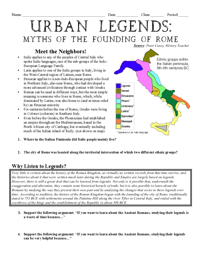 Name ___ Date ___ Class ___ Period ___Urban Legends: Myths of the Founding of Rome Source: Peter Casey, History TeacherMeet the Neighbors! Italic applies to any of the peoples of Central Italy who