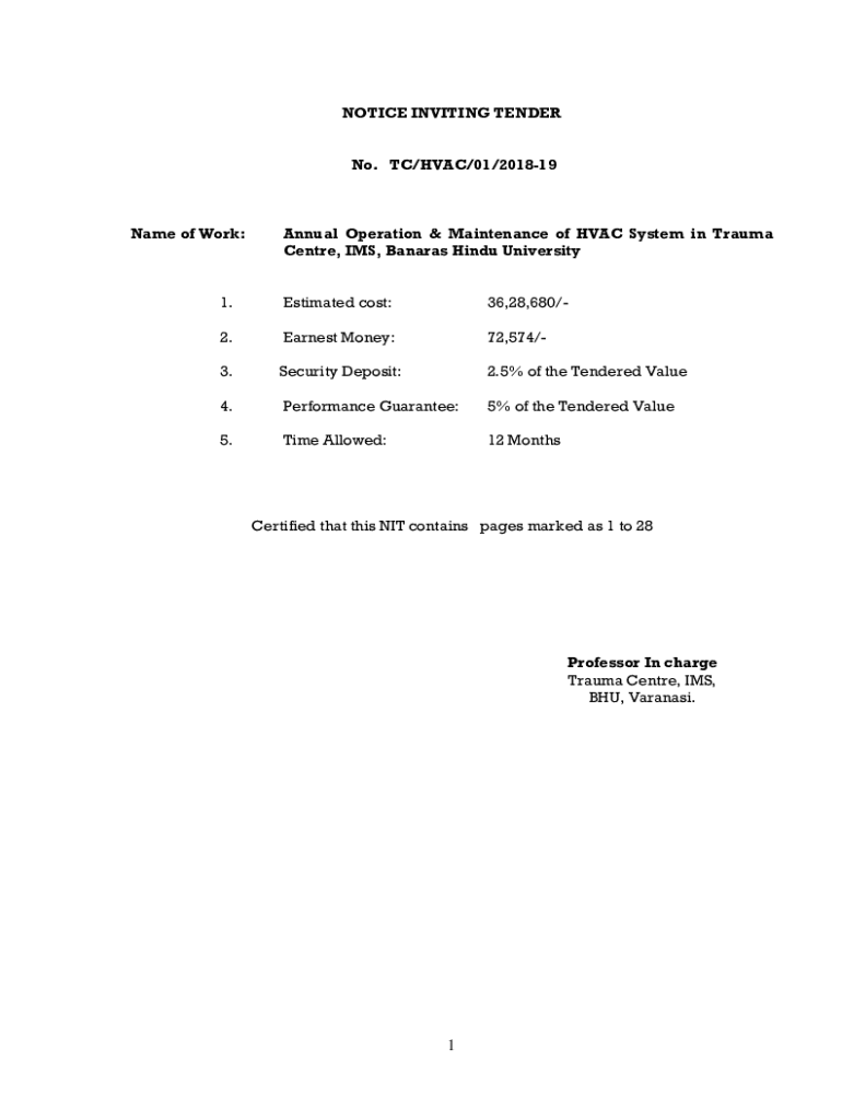 NOTICE INVITING TENDER No. TC/HVAC/01/201819Name of Work:Annual Operation & Maintenance of HVAC System in Trauma Center, IMS, Bananas Hindu University1. Estimated cost:36,28,680/2. Earnest Money:72,574/3.