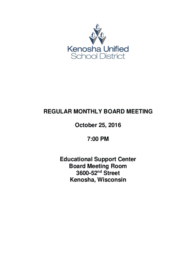 REGULAR MONTHLY BOARD MEETING October 25, 2016 7:00 Educational Support Center Board Meeting Room 360052nd Street Kenosha, Wisconsinites page intentionally left blankRegular School Board Meeting October
