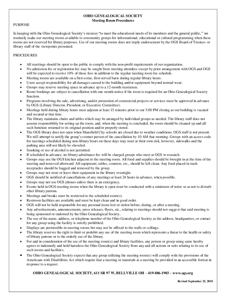 OHIO GENEALOGICAL SOCIETY Meeting Room Procedures PURPOSE In keeping with the Ohio Genealogical Societies' mission to meet the educational needs of its members and the public, we routinely make our