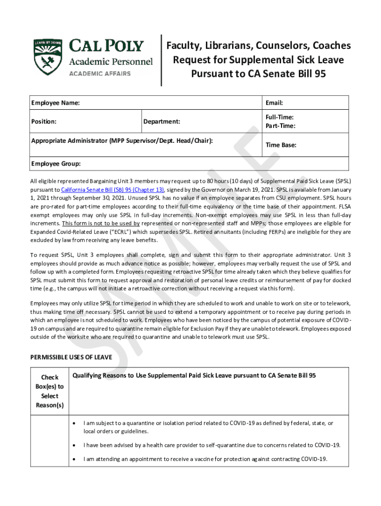 Faculty, Librarians, Counselors, Coaches Request for Supplemental Sick Leave Pursuant to CA Senate Bill 95 Employee Name:Email:Position:Department:Appropriate Administrator (MPP Supervisor/Dept. Head/Chair):Halftime: